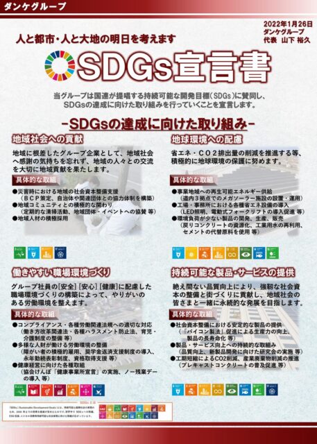 SDGsの取り組みを宣言いたします 2022年01月26日 2022年1月26日、ダンケグループは「SDGs宣言」を致しましたのでお知らせ致します。 ダンケグループは国連が提唱する持続可能な開発目標(SDGs)に賛同し、SDGsの達成に向けた取り組みを行っていくことを宣言します。